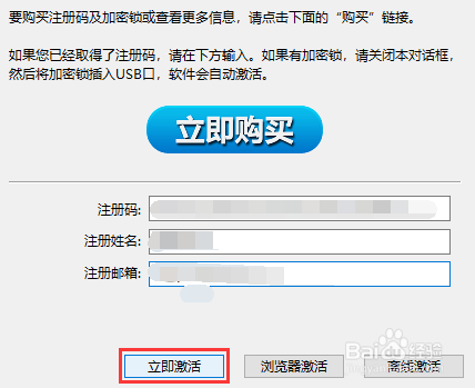 2/9软件将显示如下注册对话框。请输入注册码、注册姓名和注册邮箱,然后点击立即激活按钮。激活成功后,注册对话框会自动关闭