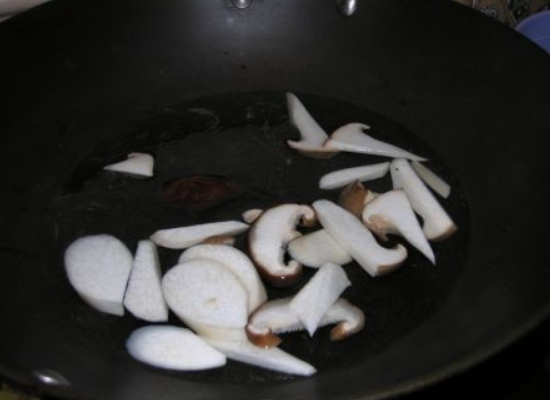 12.南瓜和胡萝卜变软后,加入蘑菇,如下图所示: