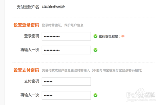 4/7注册的第二步,需要我们设置好支付宝的密码信息,比如登录密码,支付密码。还需要输入自己的身份信息,这里的身份信息填写自己的信息,和之前支付宝的身份信息一样就行。