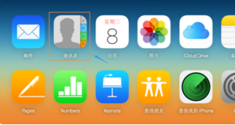 2、登录以后就会在首页看到苹果手机里面自带的一些程序,比如邮件、通讯录以及日历等,我们点击其中的通讯录然后就会看到目前手机里所有的联系人: