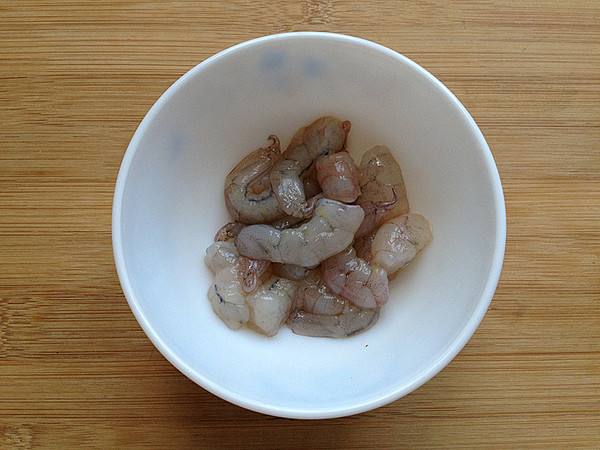 1、取三分之一的虾仁切大块,再用料酒、少许盐和少许白胡椒粉拌匀,腌制10分钟。