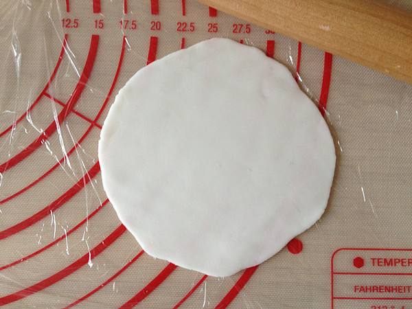 9、制作面皮方法:先在案板上铺垫一层保鲜膜(可以防粘),再将一块面团放在上面(切口朝上),并用手掌按扁,再擀成圆形的面皮(尽量薄点)。