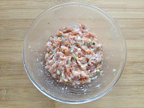 辅料:猪肉末100克、虾仁100克、香葱2根、姜5克、胡萝卜20克、鸡蛋清15克、盐2克、糖1克、食用油5克、料酒2克、白胡椒粉1克、鸡精1克