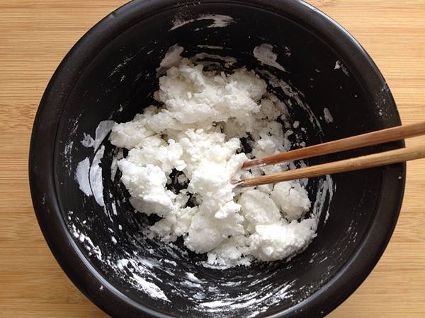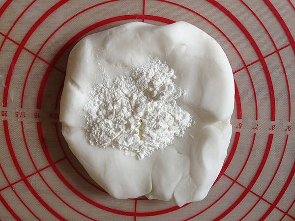 7、面团焖好后,分三次加入剩余的20g淀粉,揉成至光滑细腻。