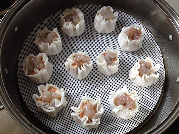 12、全部做好后,放入蒸锅(记住,笼屉上要放不粘垫,如果没有,可以放萝卜片或菜叶),大火将水烧开后,转中火蒸10分钟即可。