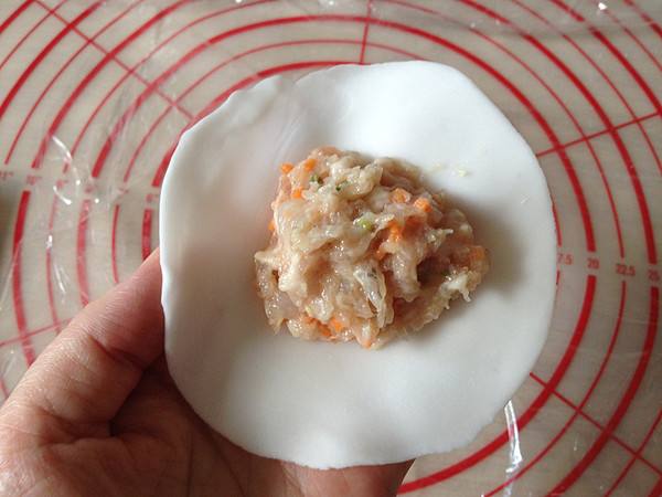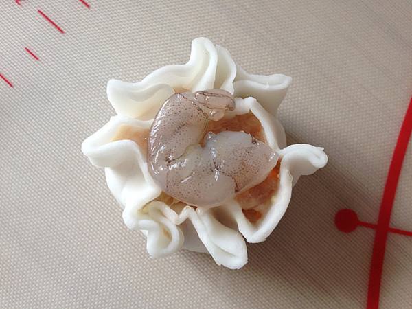 11、做成烧麦的形状,再在上面放一个大块的虾仁。