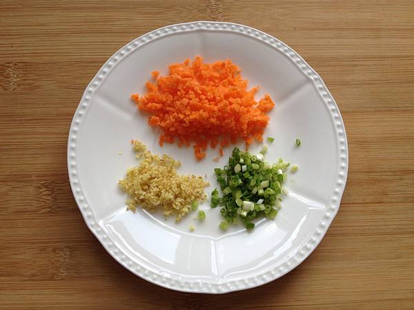 3、把香葱切成葱花,姜切末、胡萝卜切成碎末备用。
