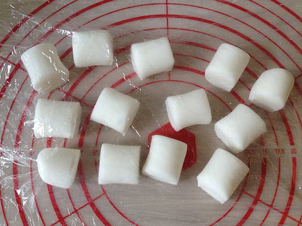 8、将面团搓成长条后切小段,并用保鲜膜盖上,以免风干,随用随取。