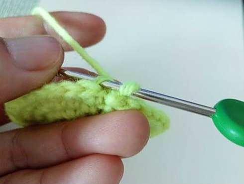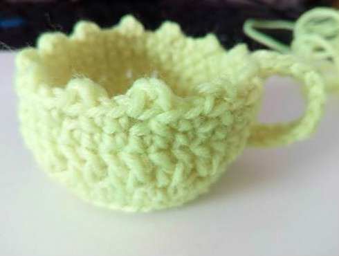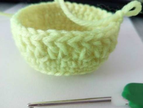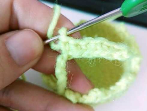 11、钩杯子手柄,不用断线,钩12个锁针,固定在第七圈的位置即可;