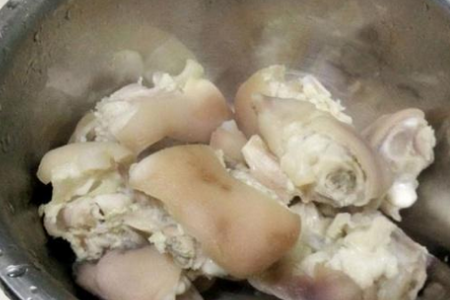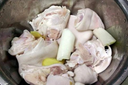 1、买回来的猪蹄,将猪毛刮干净,可以放在火炉上烤一下,然后再刮干净。刮干净后斩成小块,放在清水里浸泡一段时间。