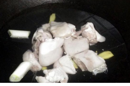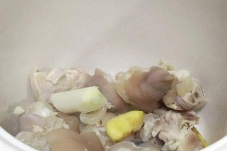 4、将猪蹄放入锅中,放入姜片和葱段。