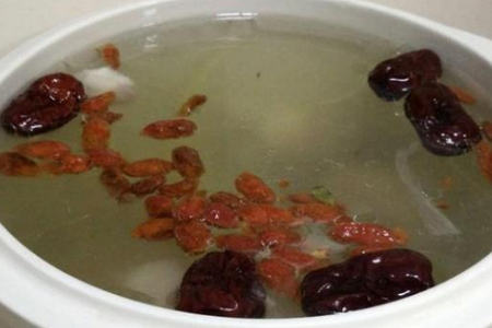 7、结束前30分钟,将红枣和枸杞放入锅中继续炖,最后加点盐调味即可。