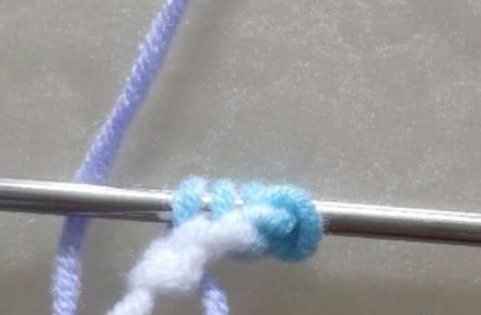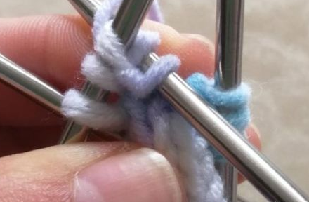 2、接着是1变3,织一针不要脱出线圈,绕加一针,从侧边再加一针。