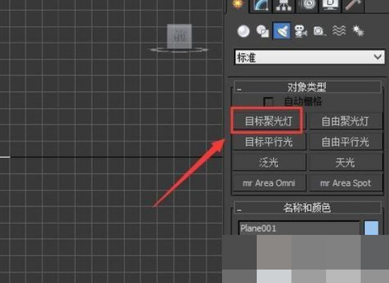 4、创建平面之后再找到灯光选项,点击该选项在其内选择目标聚光灯选项,