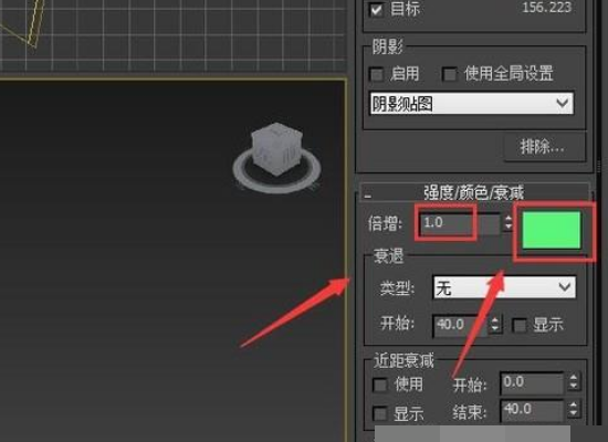 7、设置好之后再找到强度/颜色/衰减选项,在其内设置颜色为绿色,倍增值为1