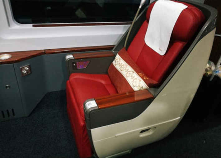 商务座中设有独立洗手间、吧台、衣帽间和冰箱的商务区以及堪比飞机头等舱的商务座位。在左侧扶手内,隐藏着一部微型液晶电视,里面有多部电影可以选择。其下侧则是220V的电源插座,将手提电脑的插头插入后,马上就可以进入充电状态。