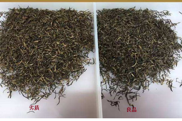 外观上,优质干茶色泽独特均匀、金黄黑相间、乌中透黄、油润鲜活、有光泽、白毫显露,条索壮实紧结、秀挺略弯曲、似海马型、匀整没有茶末和杂物。