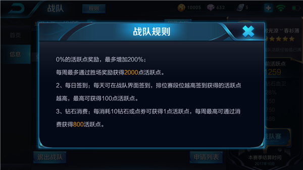 4)每天在战队界面签到,排位赛段位越高签到获得的活跃点越高,最高可获得100点活跃点。