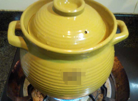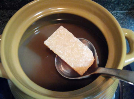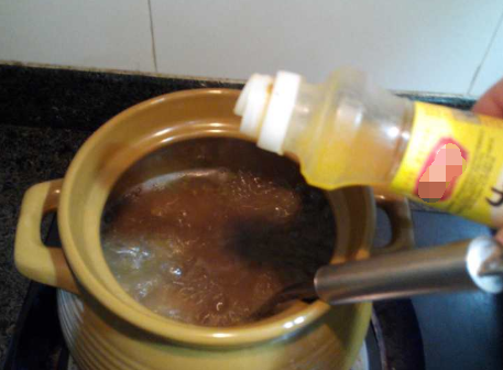 8、倒入姜汁糖继续开火大火煲开至黄糖完全融化。
