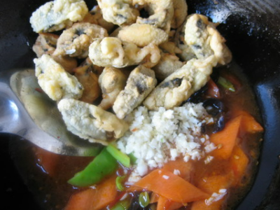 汤汁粘稠后,放入蒜末和炸好的皮蛋快速炒均即可。