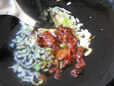 6、炒锅倒油,油温热后下葱姜末炝锅,再下辣豆瓣酱、料酒、酱油、醋、糖、少许清水炒均烧开。