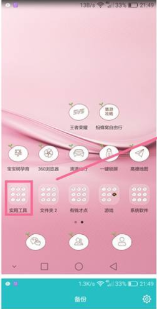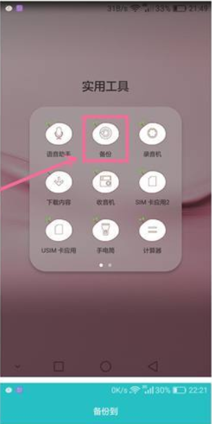 1、备份方法:打开手机的“实用工具”中的“备份”应用工具,