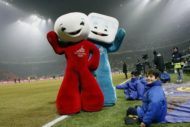 2006年意大利都灵冬季奥运会吉祥物“内韦”和“格利兹”。“内韦”的形象是一个身着红色服装的小女孩,长着一副圆圆的脑袋,形状宛如雪球;“格利兹”则是一个身穿蓝色服装的小男孩,长着一个方脑袋,形状宛如小方冰块。