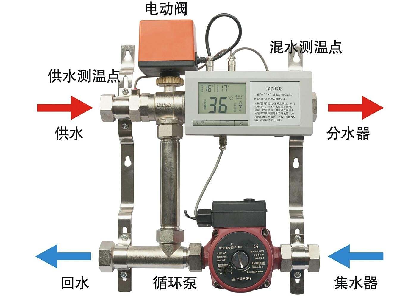 混水降温装置中有两个核心部件:一是用于提供采暖散热后低温水与高温进水混合的动力装置,一般家用通常使用屏蔽泵;另外一个是用户控制高温进水与低温回水混合比例以维持混合水温度稳定的混水部件,可以有多种不同结构和方式,比如电子温控或者自力式温控装置等。