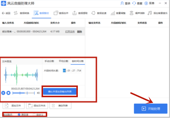 3、文件已经导入,现在大家能够来调整一下最后文件的保存地址,通过【输出路径】来自由进行挑选,然后能够根据个人的思考来切断音频,软件提供了三种分割方式 ,分别是手动分割、平均分割跟按时间分割,自行操作。最后来把留下的音频片段将剪辑的片段【确认添加并输出列表】,点击【开始处理】等一会就好了。