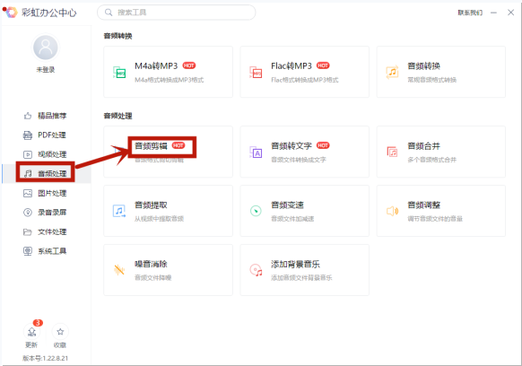这里大家能够利用一下彩虹办公中心软件,能够来满足各个办公需要,其中的工具有pdf、文件处理、视频编辑等,都是比较好用的,各位快速下载好软件,然后打开软件,在首页找到【音频处理】,然后再双眼捕捉到【音频剪辑】,添加音频素材进行剪辑设置,完成这个处理即可。