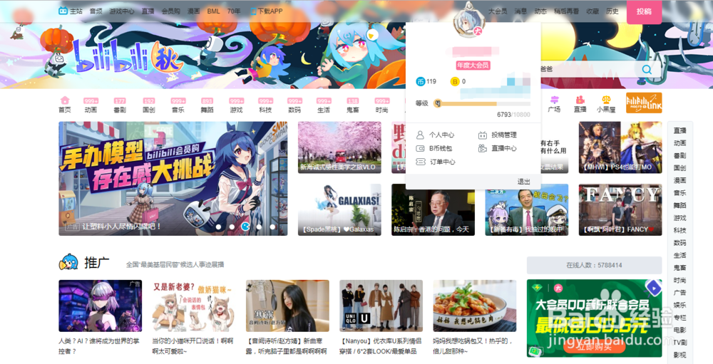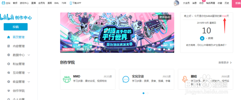4/6还是一样打开b站官方网站,将滑鼠移动到自己的头像处,下面会出现投稿管理