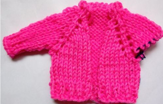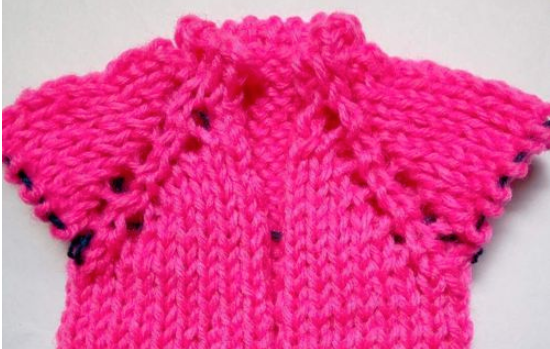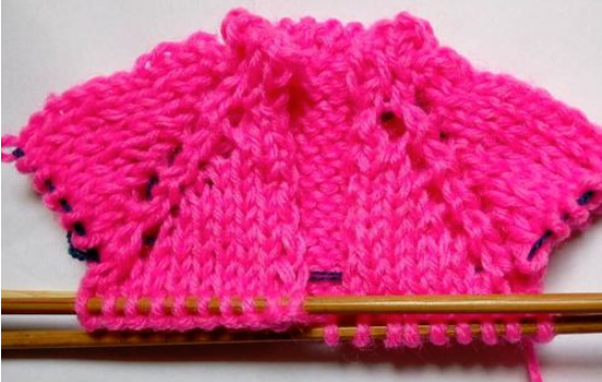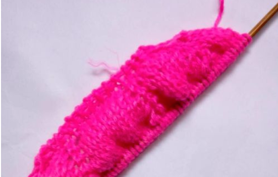 3、领子编织好后在改变针法的同时,开始在4个地方加针;一根上的18针,在第3、6、13、16针的左右各加一针,然后隔一排加一次,加到需要的大小。