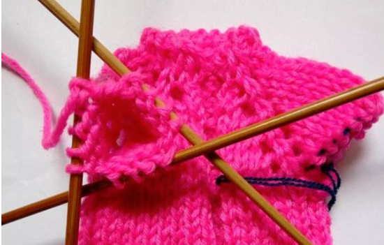 7、接下来开始编织毛衣的袖子,把袖子的线圈分别穿在3根棒针上,开始编织下针,根据需要袖子的大小在腋下收针,织到需要的长度。