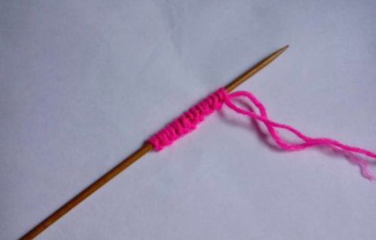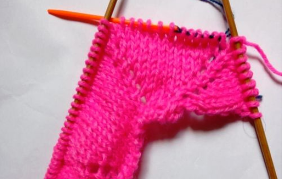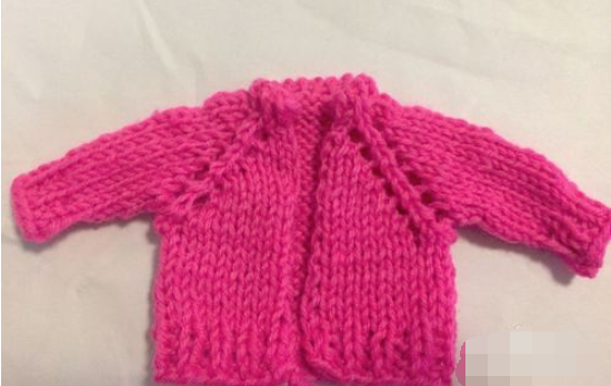 2、然后,先从领子开始编织,正反面都织一针下针,一针上针,织到领子的长度后改织下针,在反面织上针。再左右两侧的边子各2针可以在正反两面都织下针。