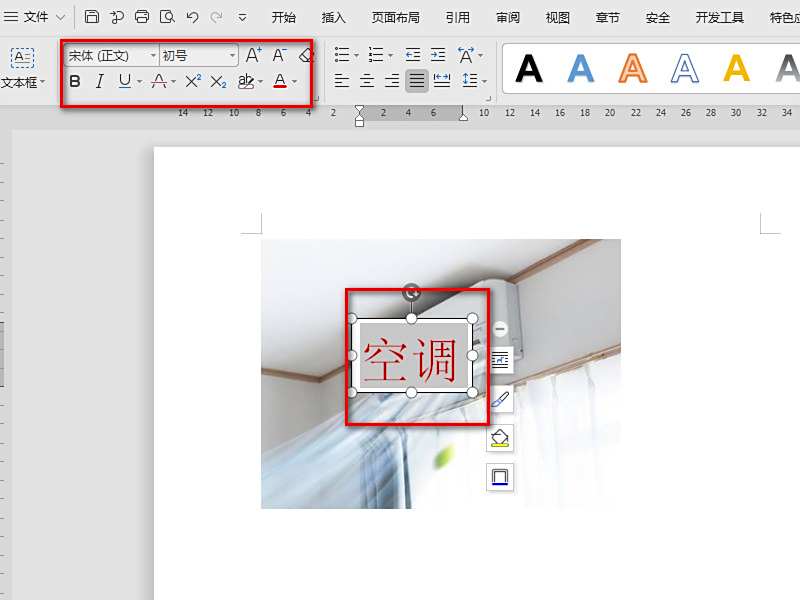 3、插入“文本框”后,在文本框内输入添加水印的内容,如图”空调“,选中内容后,设置字体的颜色、大小等。