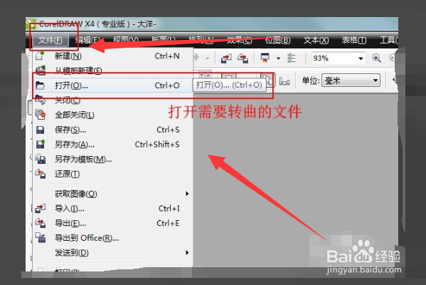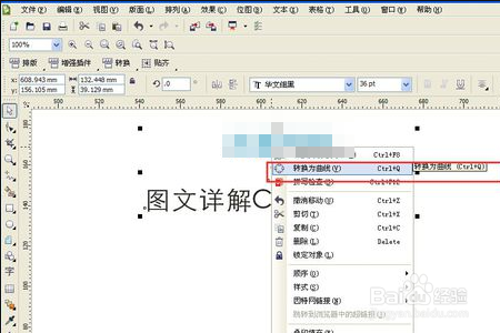 CDR软件将文字转曲时,点击打开cdr软件,点击打开选中文字后,点击转曲即可。