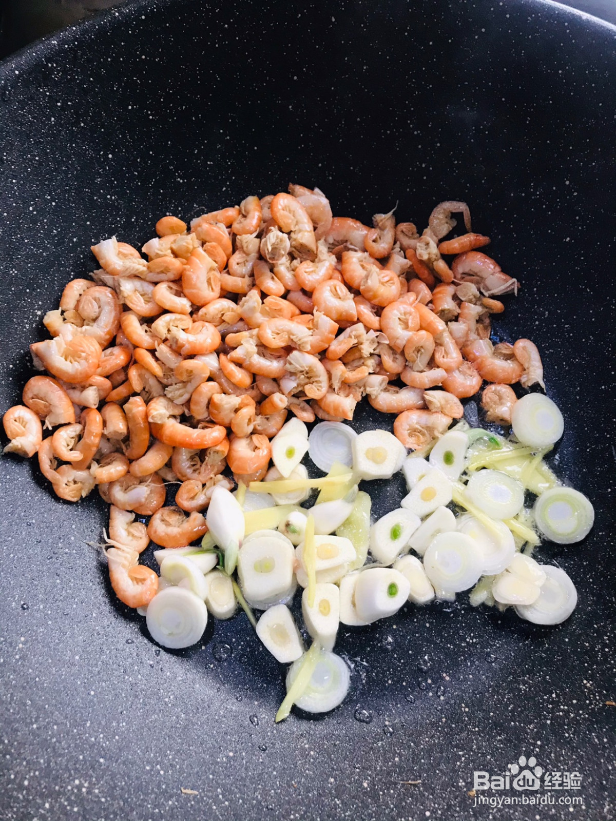 虾皮炒干后拔至一边,锅中倒入适量油放入葱、姜蒜炒香。