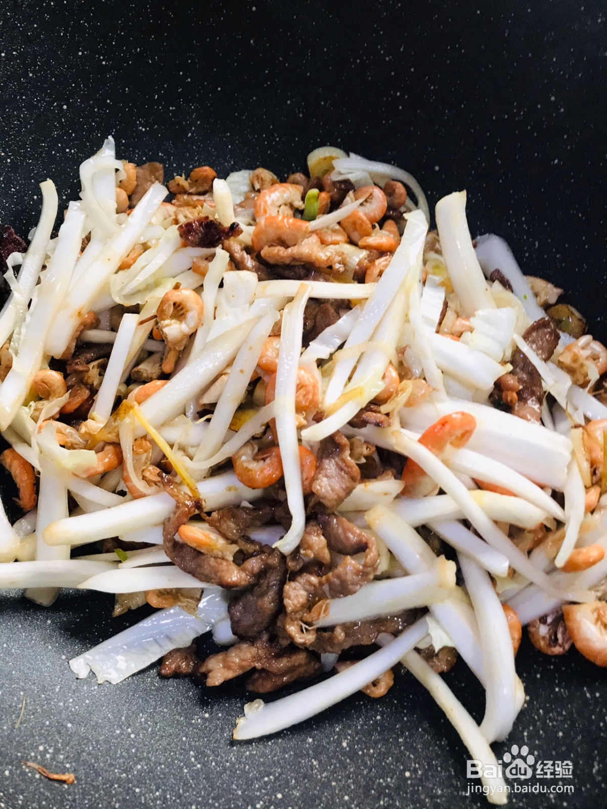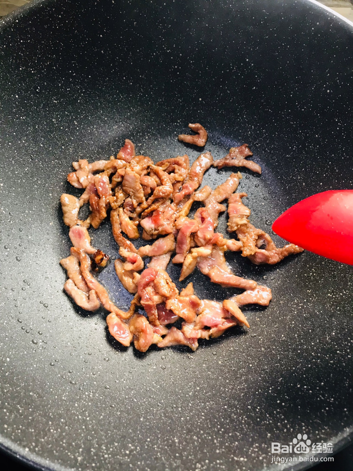 倒入瘦肉丝翻炒均匀