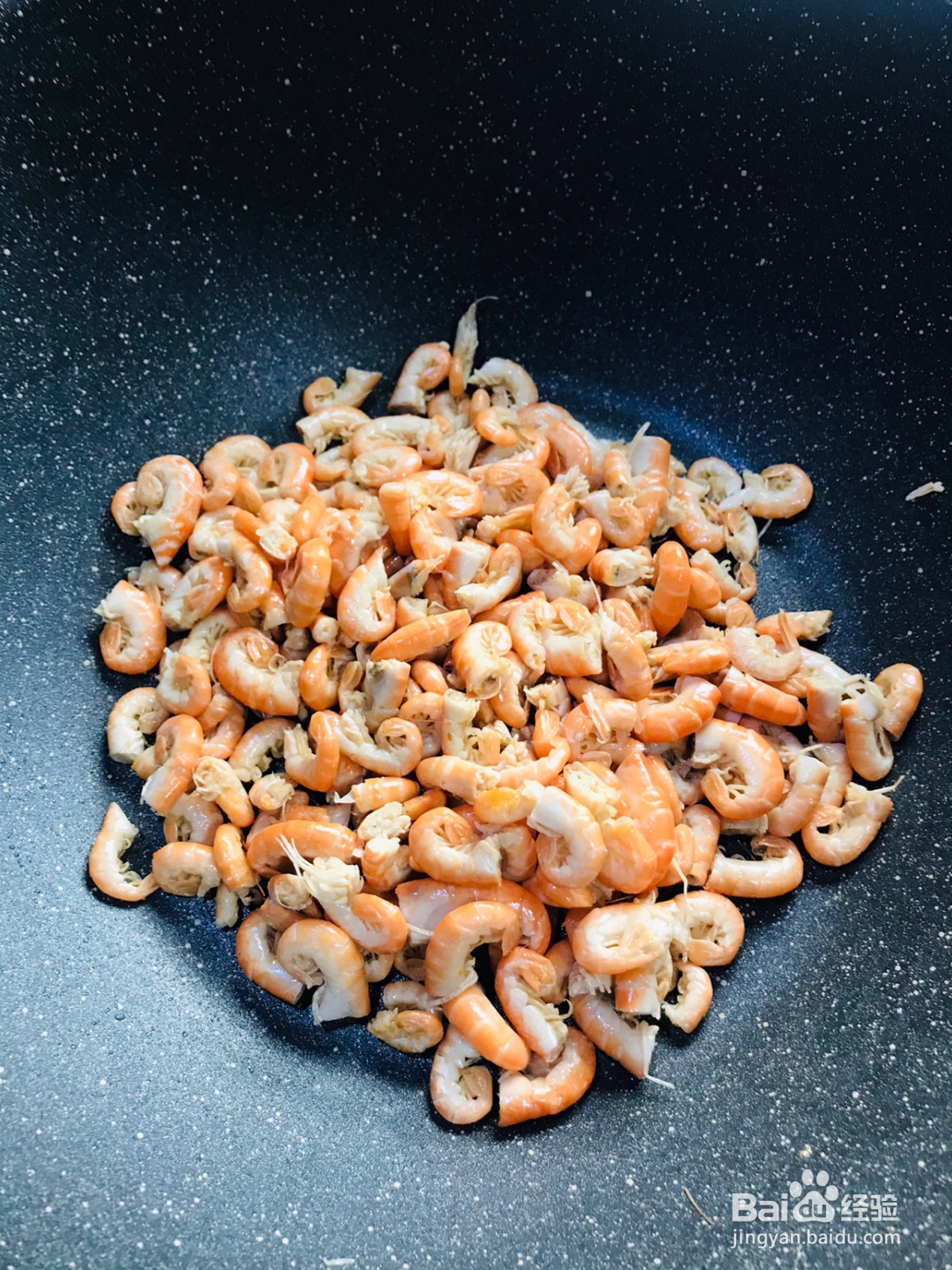 大虾皮去头、脚清洗干净,沥干水分,放入锅中炒干水分。