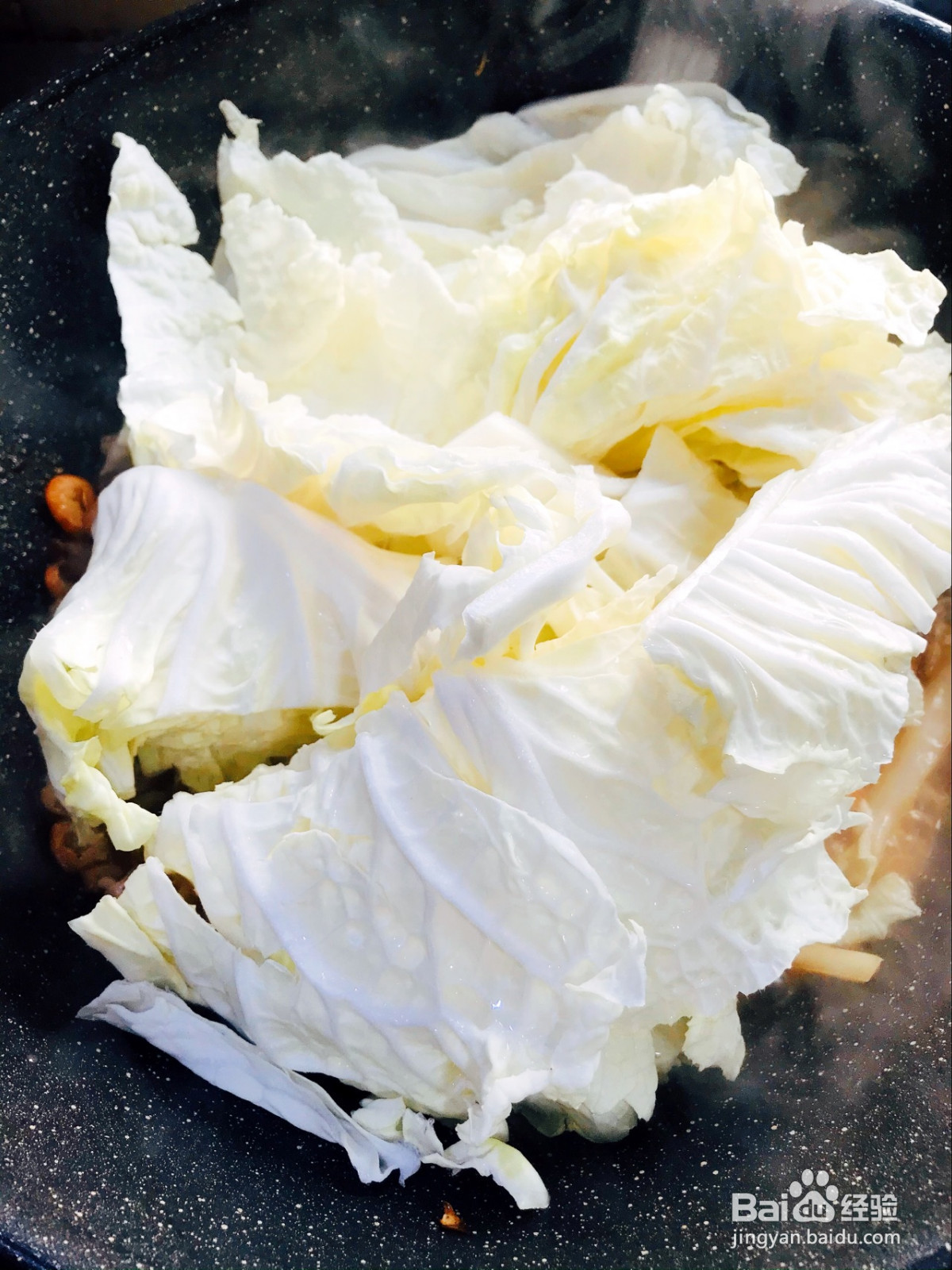 开锅后放入白菜叶翻炒均匀,煮至沸腾翻炒均匀。勾芡调味出锅!