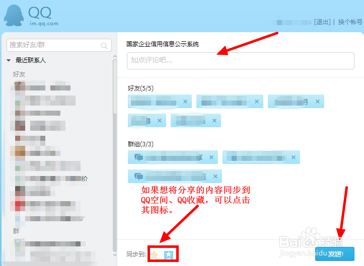 最多可以一次性选择五个好友以及三个群组进行分享,还可以在评论区写点评论,另外如果想将分享的内容同步到QQ空间、QQ收藏,可以点击选择其图标。