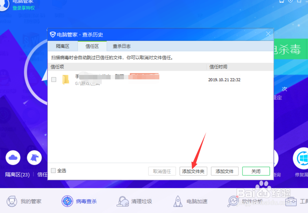 进入信任区之后,点击右下角的添加文件或者添加文件夹