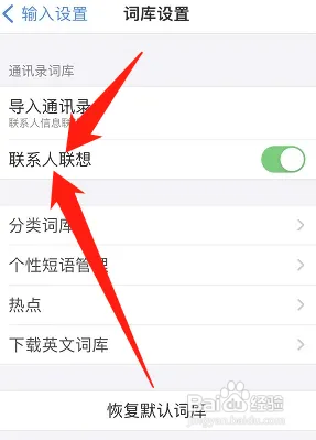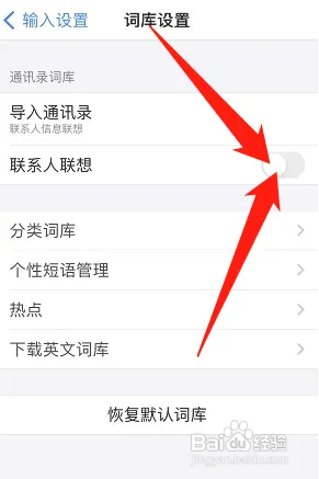 进入之后,在词库设置页面,找到联系人联想,点击打开