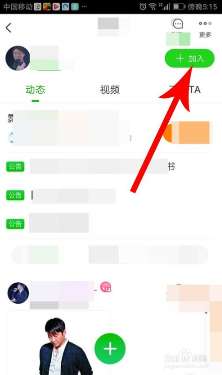 1、在爱奇艺泡泡里搜索找到想要发视频的泡泡圈,点击右上角绿色的“加入”,进入圈子首页后,点击屏幕下方的“+”添加视频;