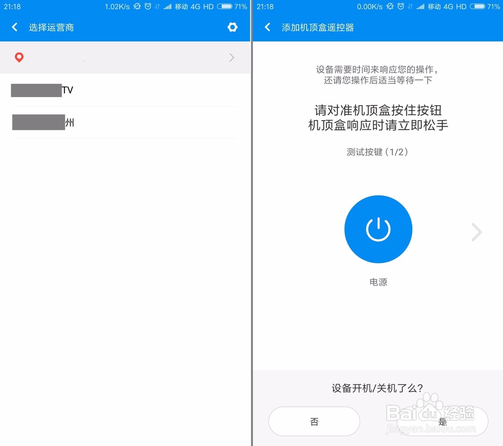 机顶盒的红外遥控器添加完成,在遥控界面左右滑动便能与电视机遥控进行切换,以后手机就可以充当电视机和机顶盒遥控器的角色。