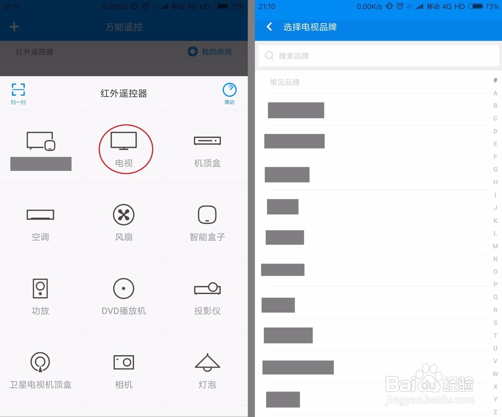 在红外遥控器选择里面选择电视,然后再根据所使用的电视机品牌进行品牌选择。