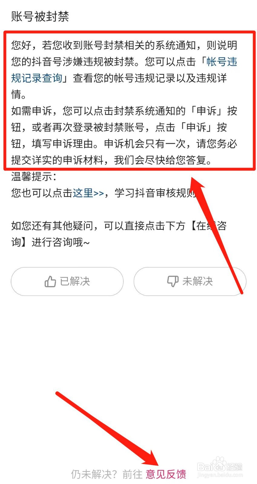 最后,根据提示进行操作,若未解决,点击【意见反馈】进行投诉即可。