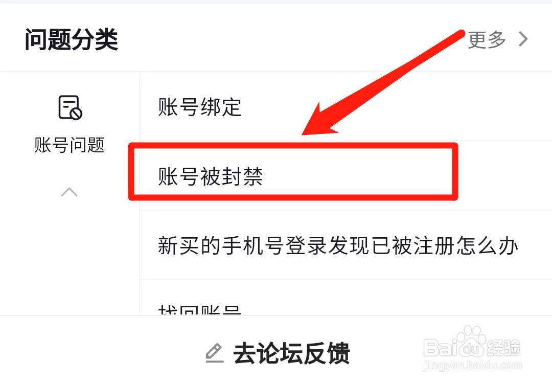 进入页面后,在问题分类下方,点击【账号被封禁】。