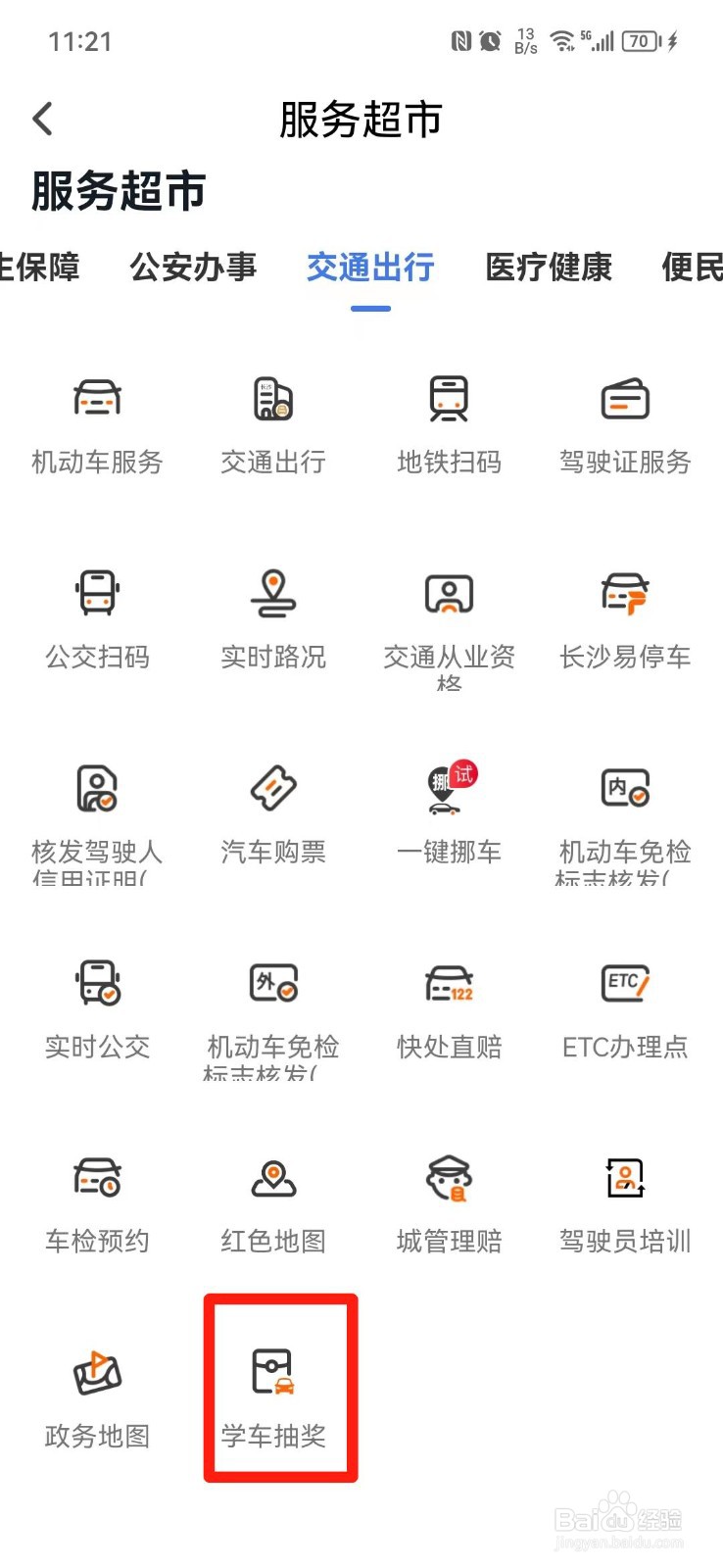 第二步:在交通出行界面下点击【学车抽奖】