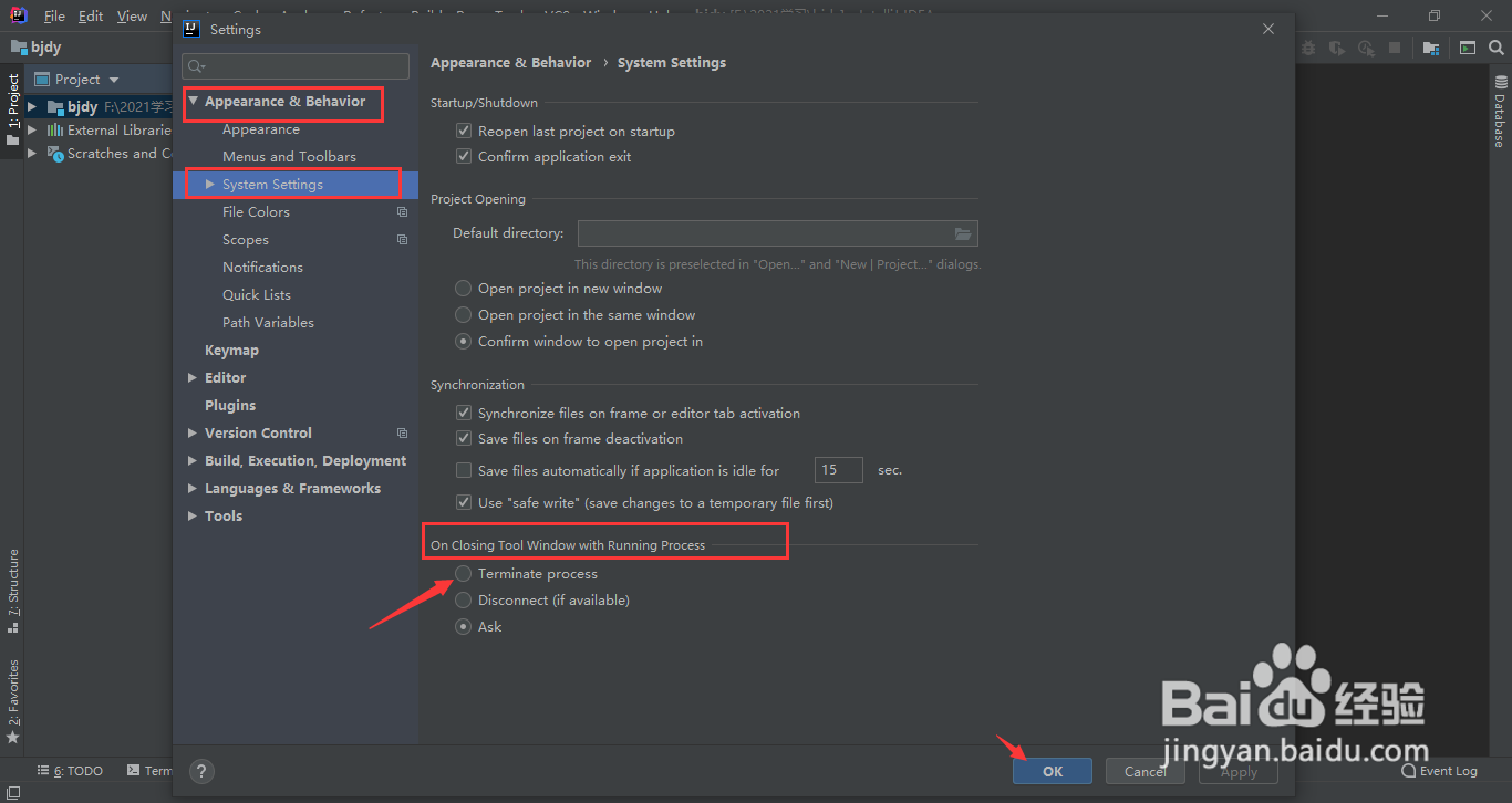 第三步,点击“Appearance & Behavior > System Settings”选项后,在右侧设置框中的"On Closing Tool Window with Running Process"模块中,将“Terminate process”选项选中,点击“ok”按钮就可以设置正在运行的进程将断开连接并以静默方式终止了。